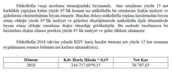 Örnek rapordan da görüleceği üzere, vergi incelemesi esasında mükellef tarafından verilen bilgi esas alınarak kazanç tespiti yapılmıştır. Vergi incelemesi esasında veya tutanak imzalanırken konunun uzmanı kişilerden destek alınması önem arz etmektedir. Zira, tutanağa bağlanan her bilgi mükellefler tarafından aleyhlerine delil teşkil edebilir. Eğer inceleme raporunda kar marjları yanlış belirlenmişse, konuyla ilgili dava açılarak vergi ve cezaların bir kısmı iptal ettirilebilir.